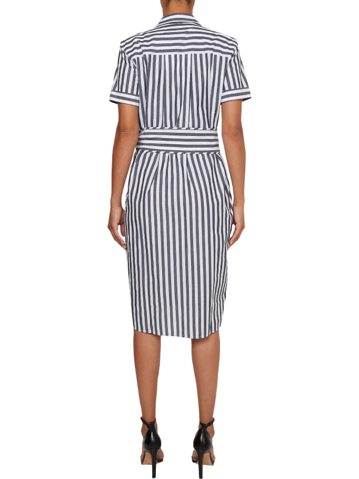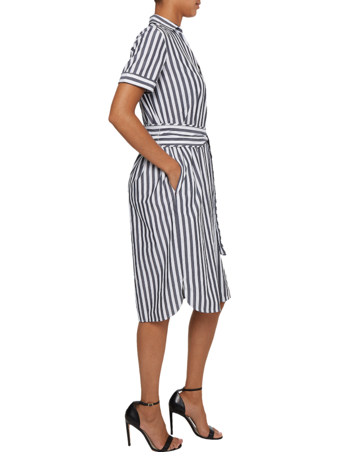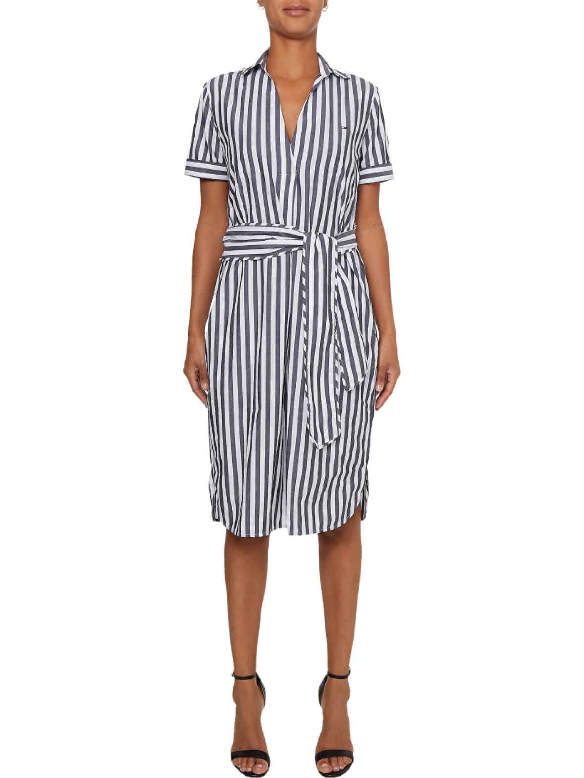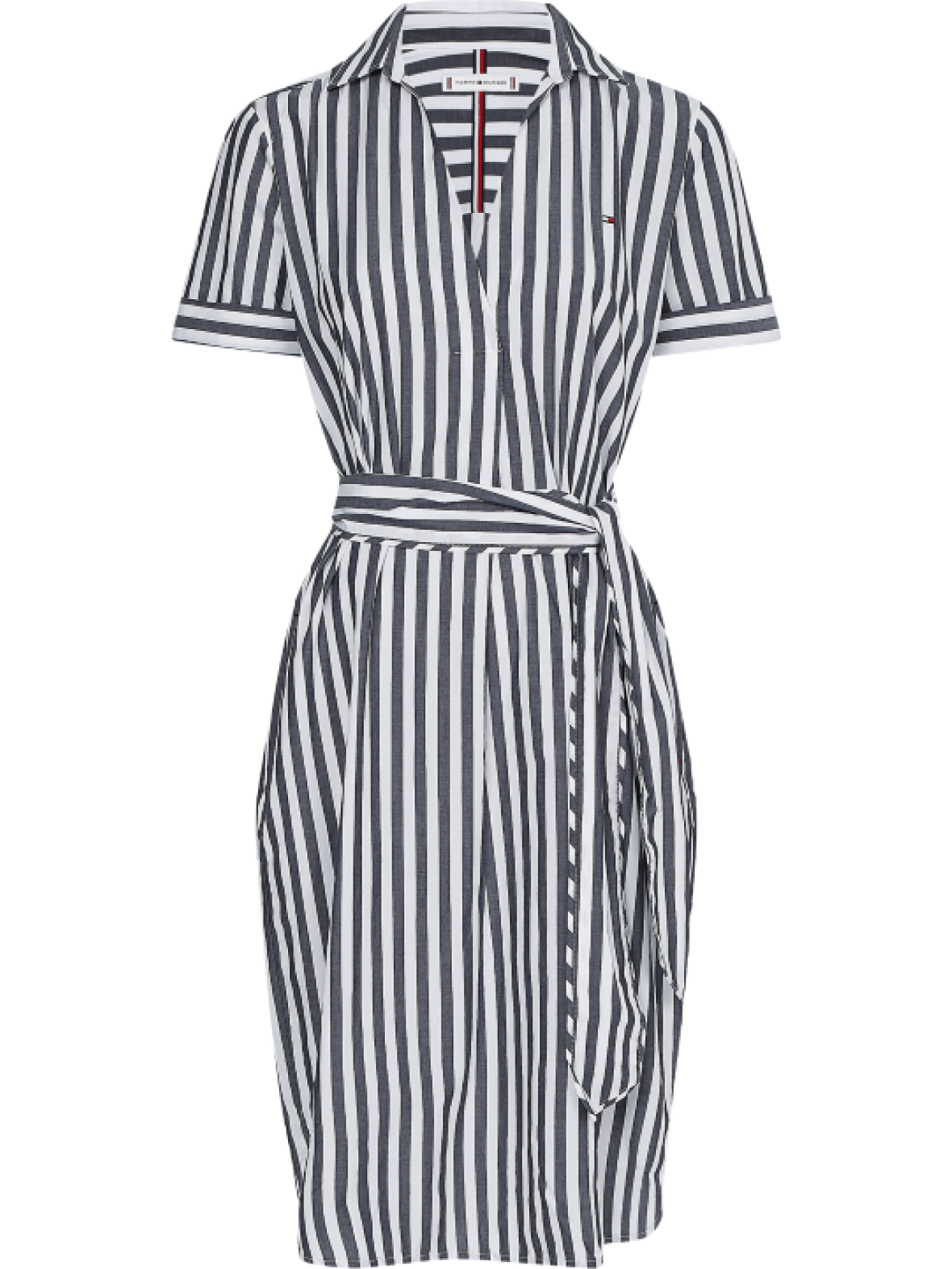Skøn kjole fra Tommy Hilfiger. Den går til omkring knæet og har slids i begge sider. Den er med V-udskæring samt bindebælte, som kan kan taljere lidt med.
