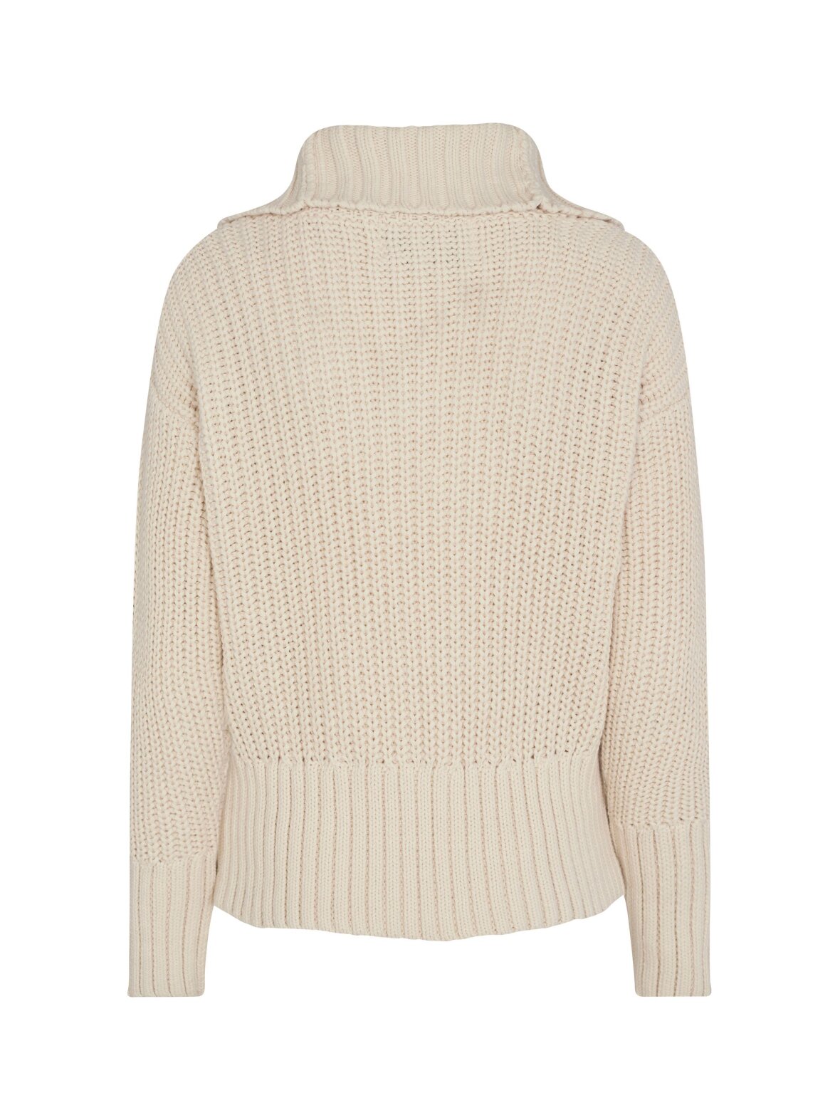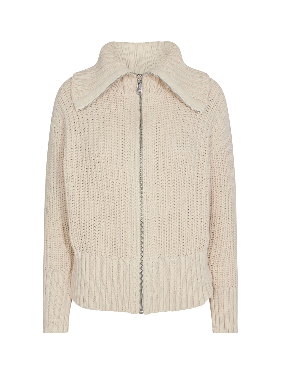 Lækker tung bomulds strik fra Leveté Room. Det er en cardigan med lynlås hele vejen igennem. Den er designet med en høj stor krave som enten kan lynes helt op og foldes som rullekrave, eller blot ligge fint ned. Der er en bred ribkant med elastik i bunden og ved håndleddet.