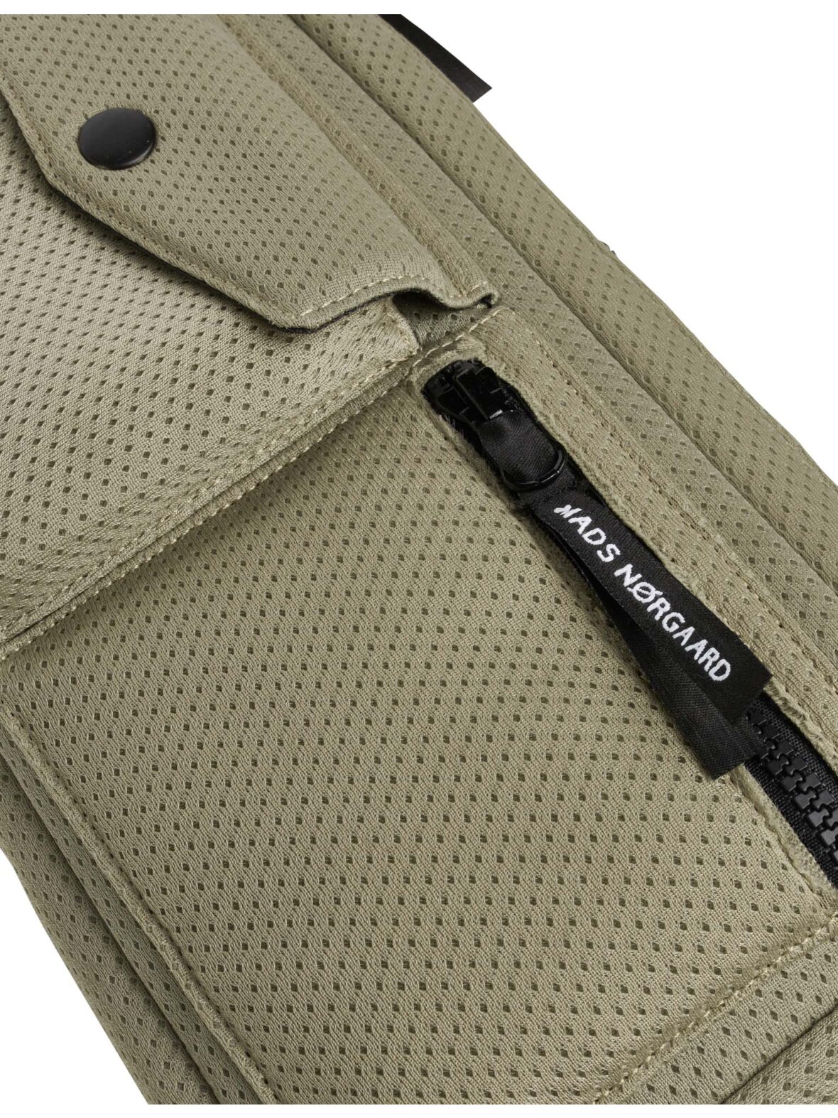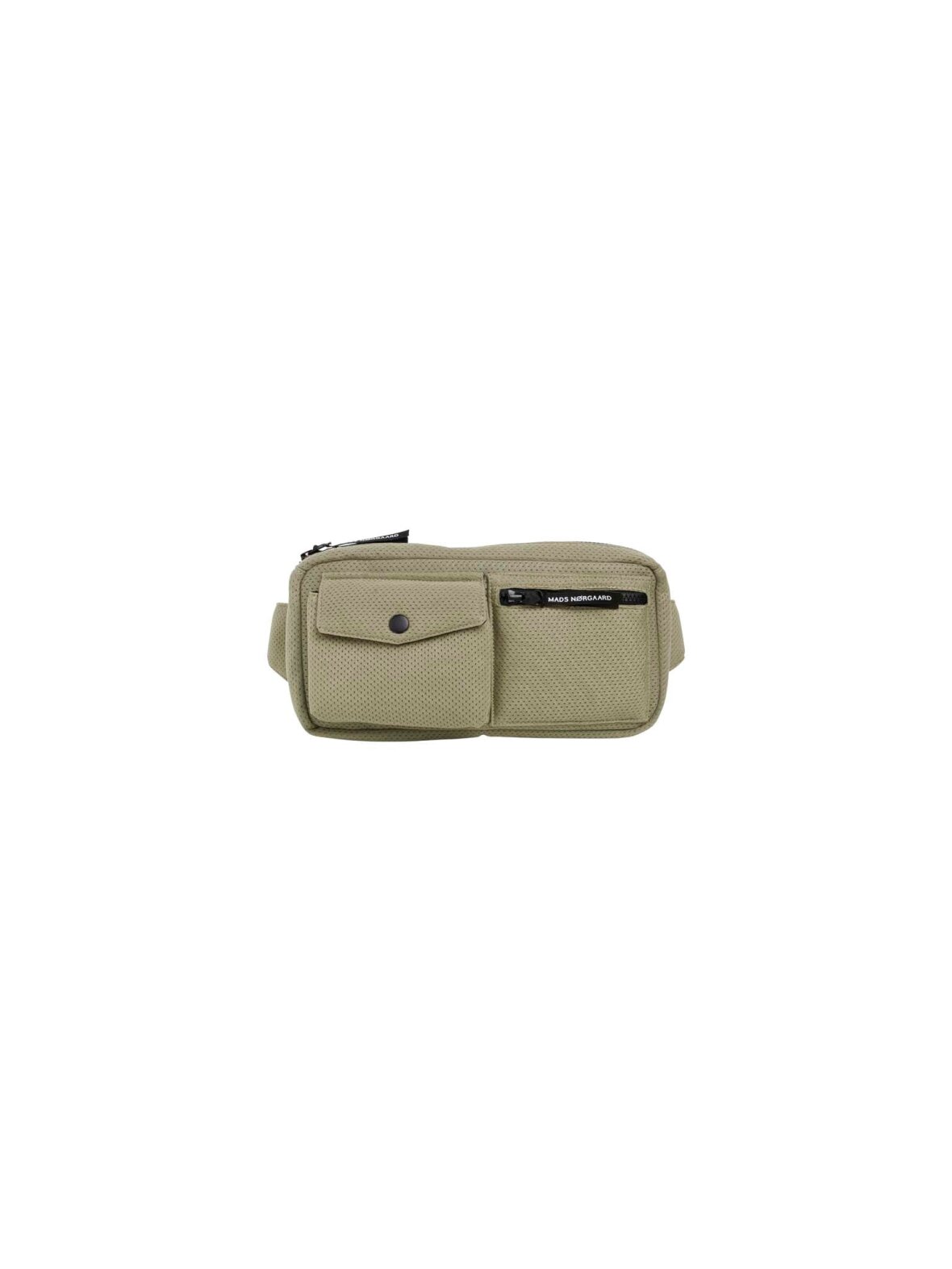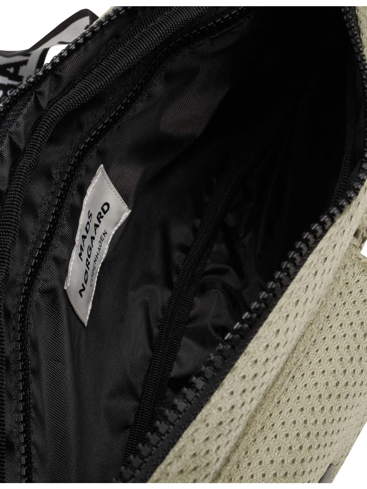 Taske fra Mads Nørgaard. Denne er en aflang model som kan bruges både som bæltetaske og crossbody. Der er mesh på ydersiden, hvilket giver et fedt look. Tasken indeholder et stort rum med lynlås - der er en lynlåslomme indvendig. Derudover er der en mindre lynlås lomme foran samt en med knaplukning. Stroppen er justerbar.
