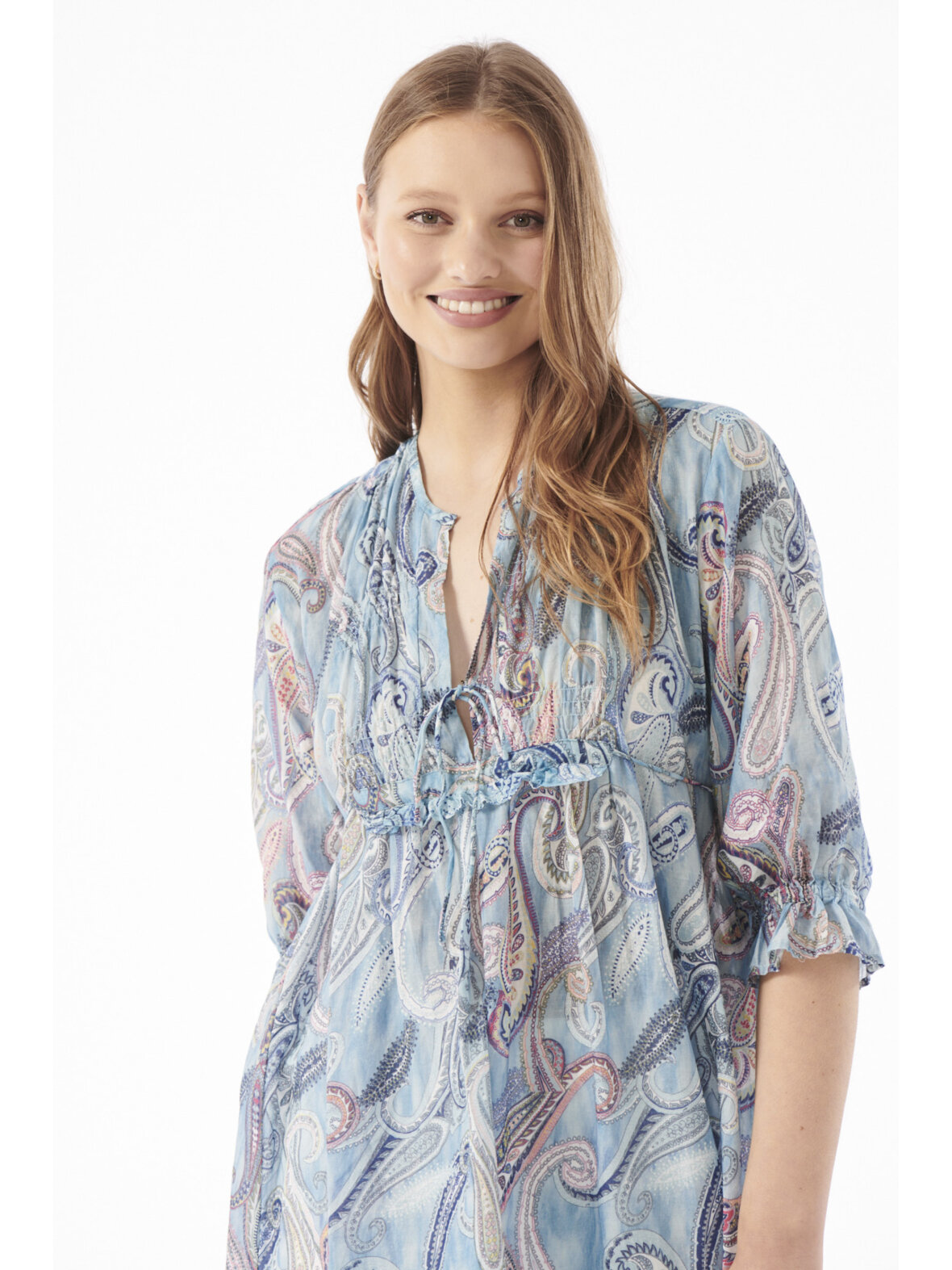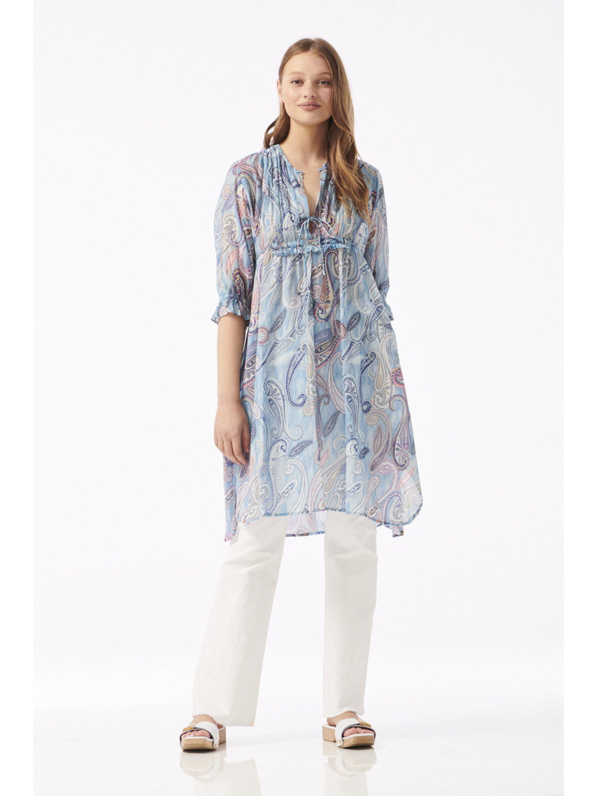 Skøn kjole fra OneSeason. Audrey er en mellemlang luftig kjole. Den har en feminin rygsamling, afrundet kant for neden og et bindebånd i taljen som man både kan binde eller blot lade hænge. Da den kan taljeres kan kjolen have to vidt forskellige udtryk. Printet her er inspireret af den græske ø Skiathos i Ægæerhavet, hvor nogle af Grækenlands fineste, nærmest eksotiske strande findes. Derudover er landskabet domineret af pyntende pinjetræer. Når man ser det smukke print kan man nærmest mærke stemningen af de fine sandstrande og det uendelige hav som alle giver et unikt indtryk og hvis man bevæger sig længere ind, de imponerende pinjetræer hvor toppens grene svæver i den blide vind.