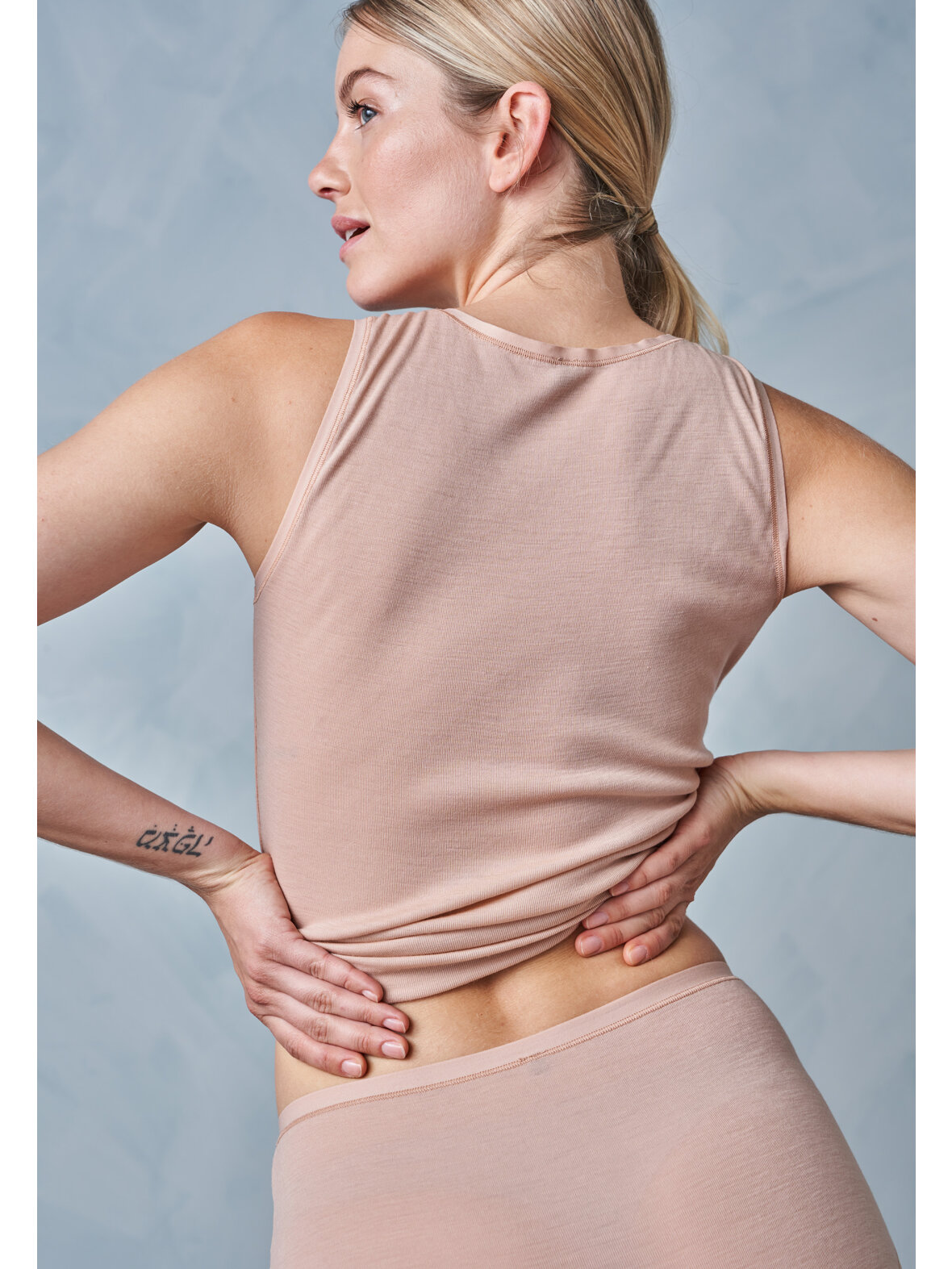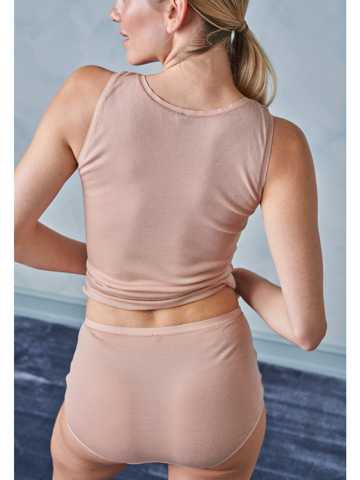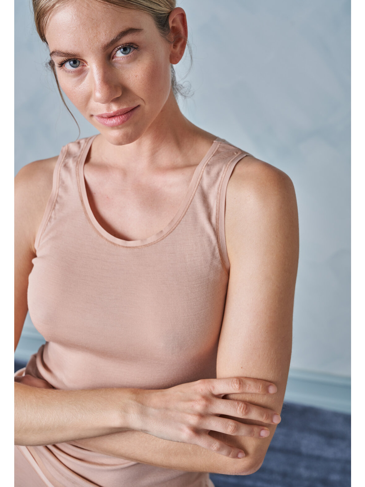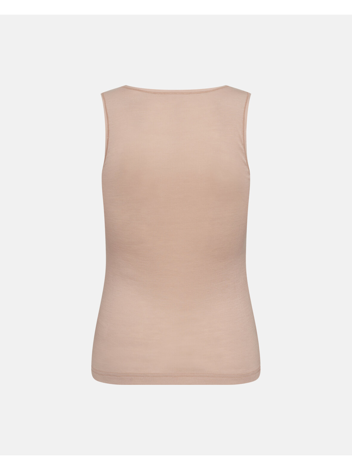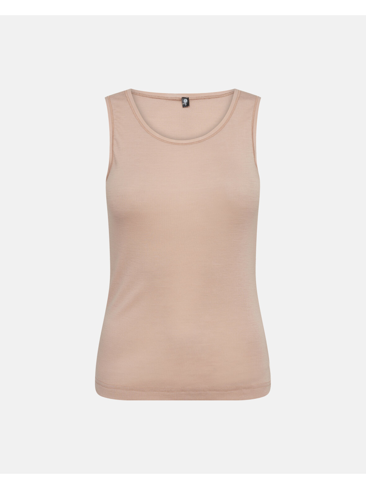 Denne klassiske top fra JBS of Denmark er fremstillet med brede stropper og en blød uldblanding, der giver både komfort og naturlig temperaturregulering. Uldens åndbare egenskaber gør toppen ideel året rundt – den holder dig varm, når det er koldt, og hjælper med at lede fugt væk, når det er varmt.