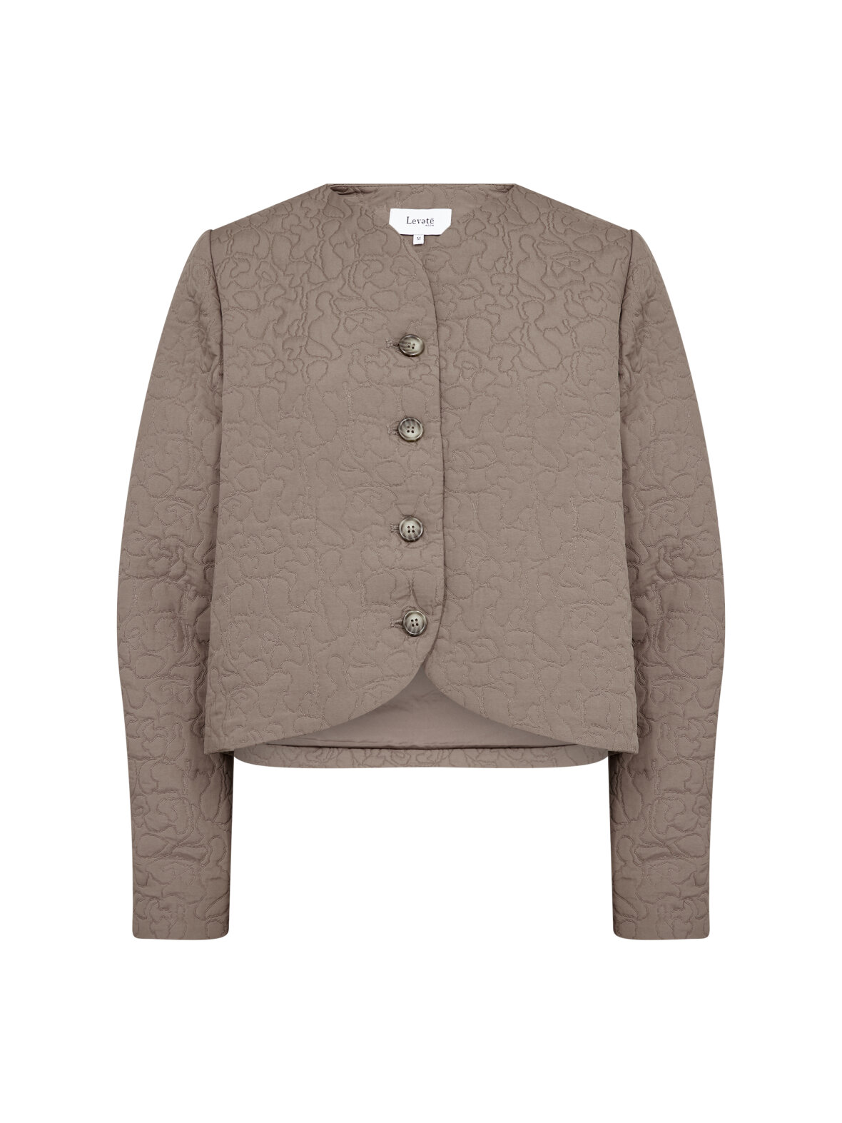 Jakken er designet med en ren rund halsudskæring, der giver et tidløst udtryk, mens de fire markante knapper fungerer som et stilfuldt blikfang. Det subtile strukturerede mønster giver stoffet liv og en eksklusiv følelse, der adskiller den fra en traditionel blazer.