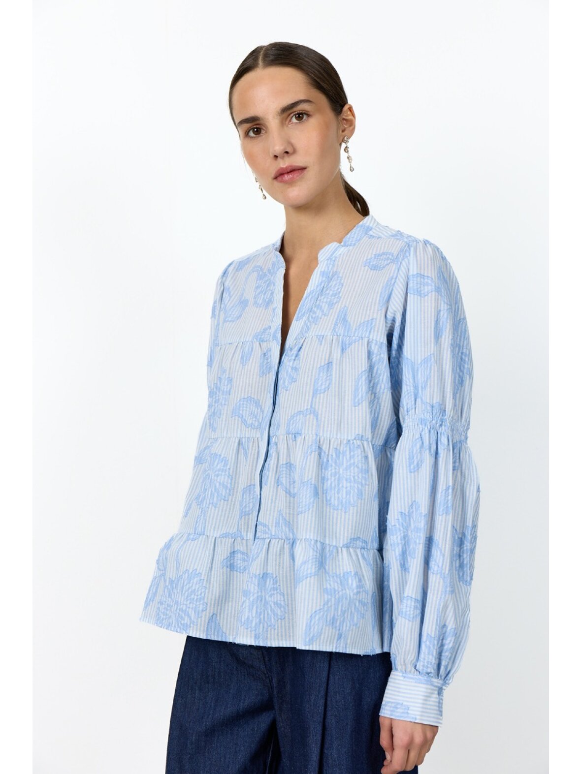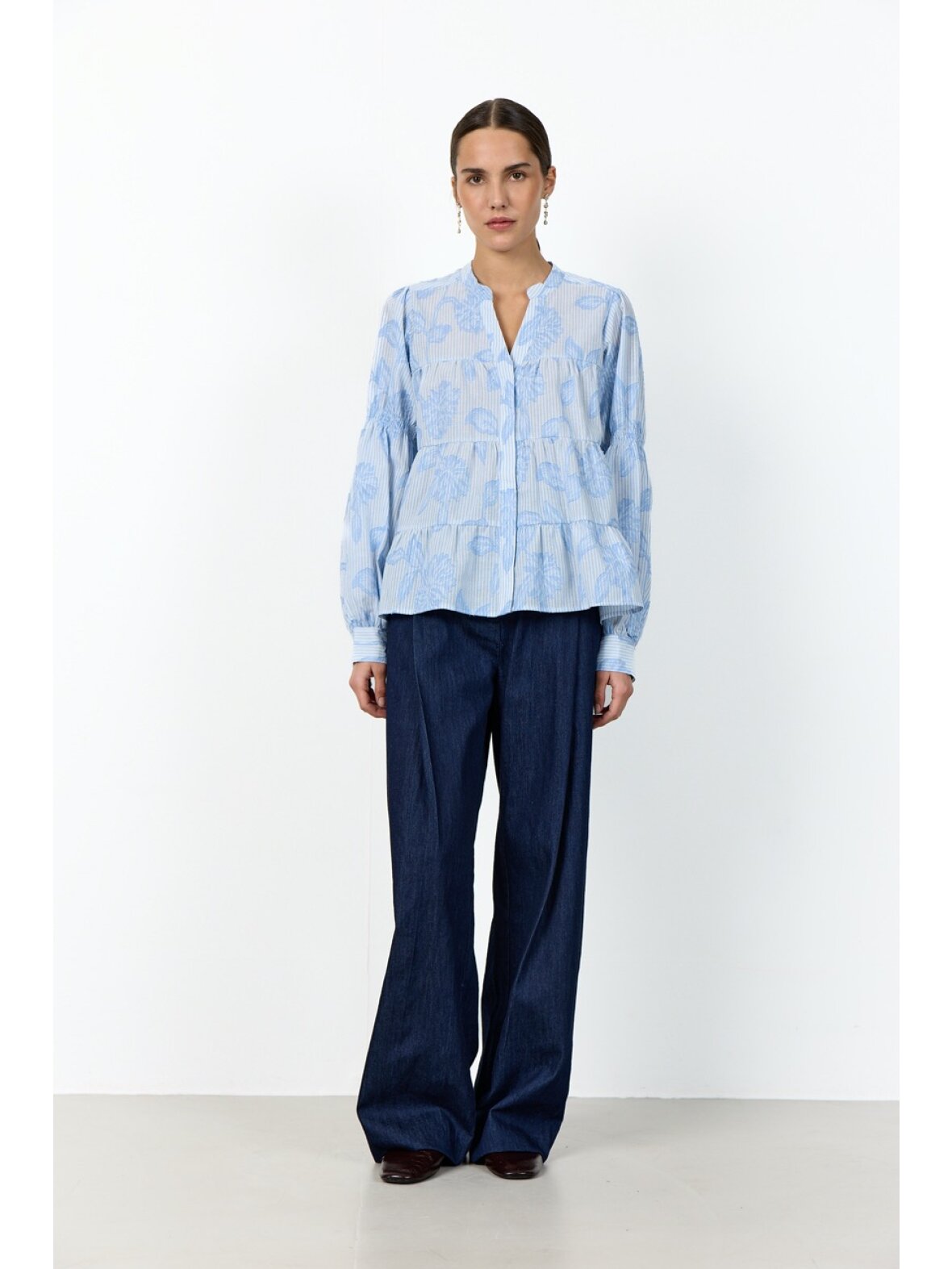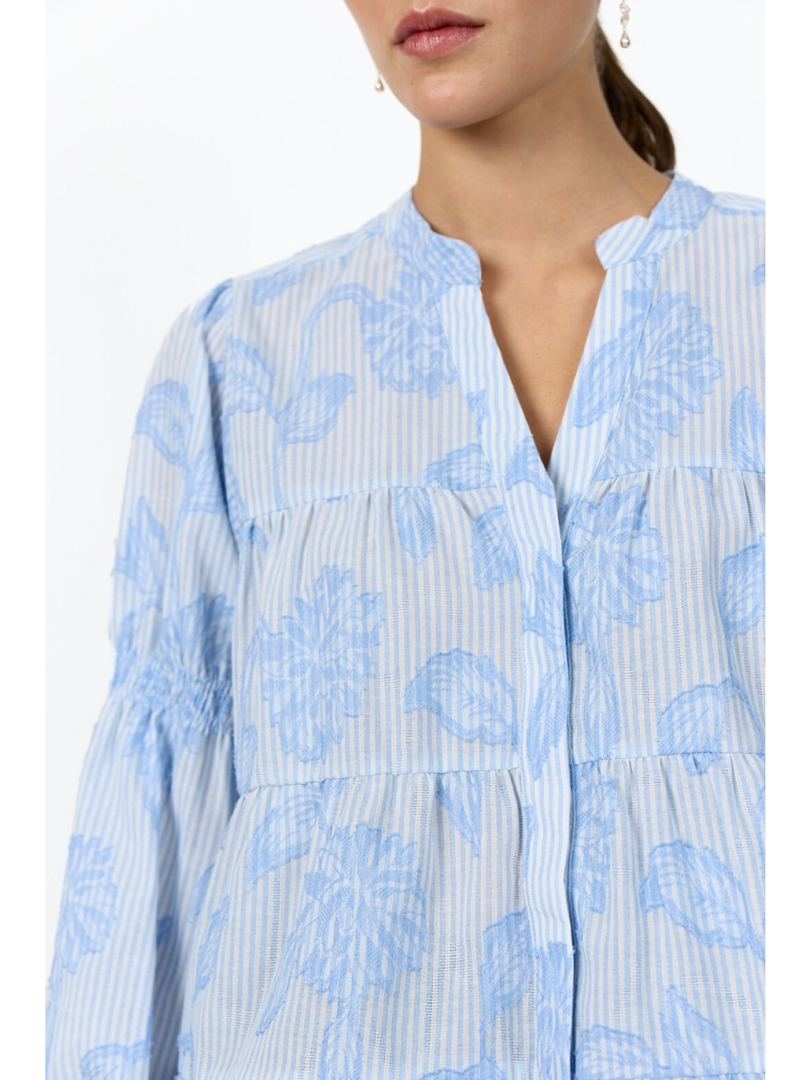 Skjorten er designet med en flatterende V-udskæring og en afslappet, lagdelt silhuet, der giver et let og luftigt udtryk. De klassiske knappede manchetter fuldender det raffinerede look.