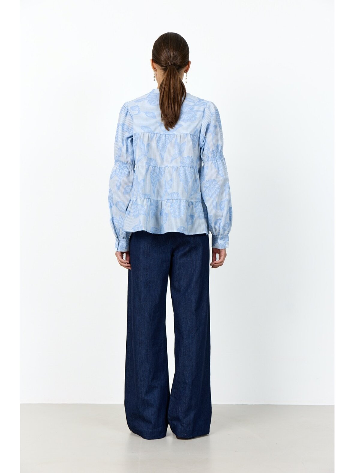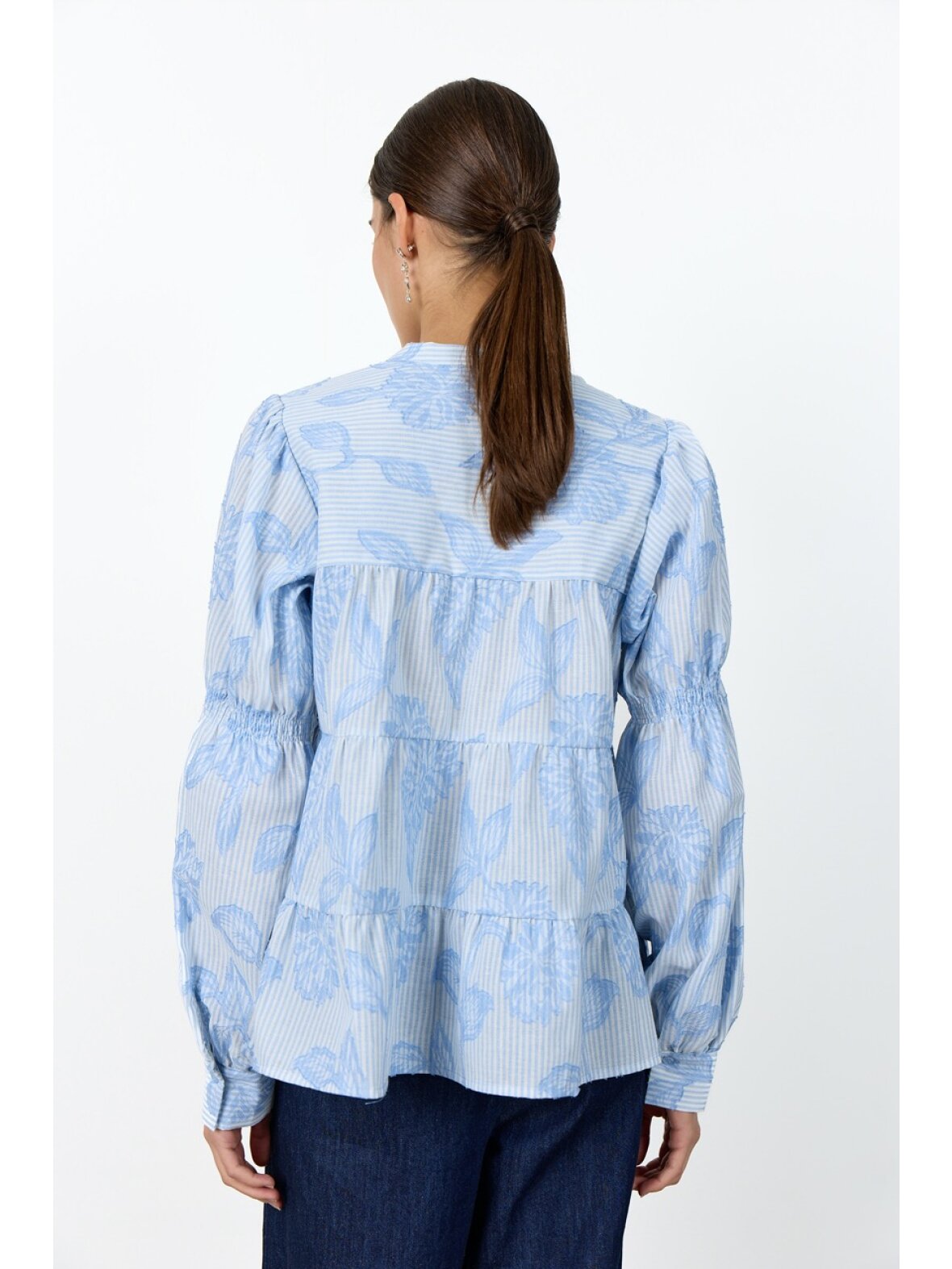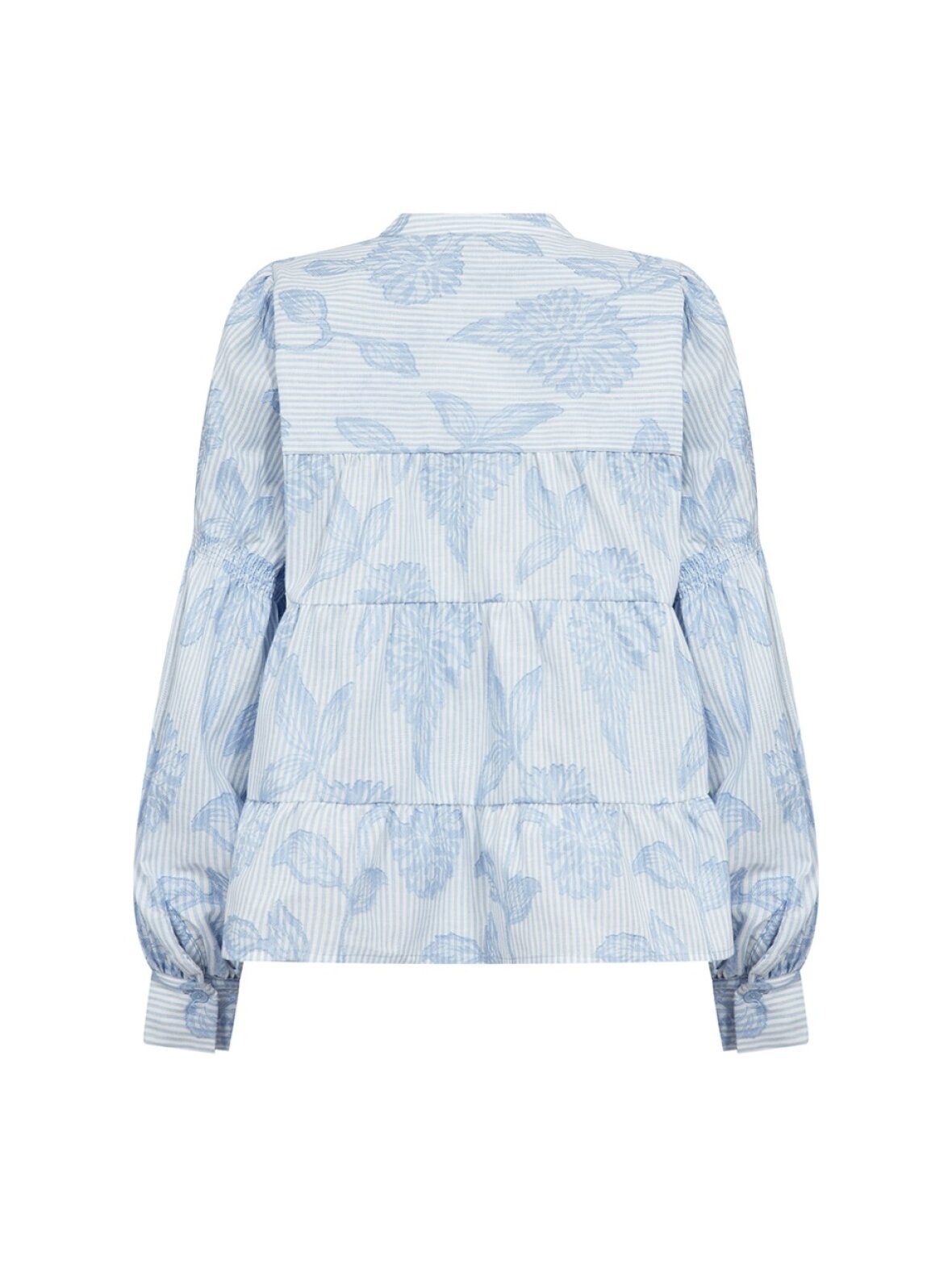 Skjorten er designet med en flatterende V-udskæring og en afslappet, lagdelt silhuet, der giver et let og luftigt udtryk. De klassiske knappede manchetter fuldender det raffinerede look.