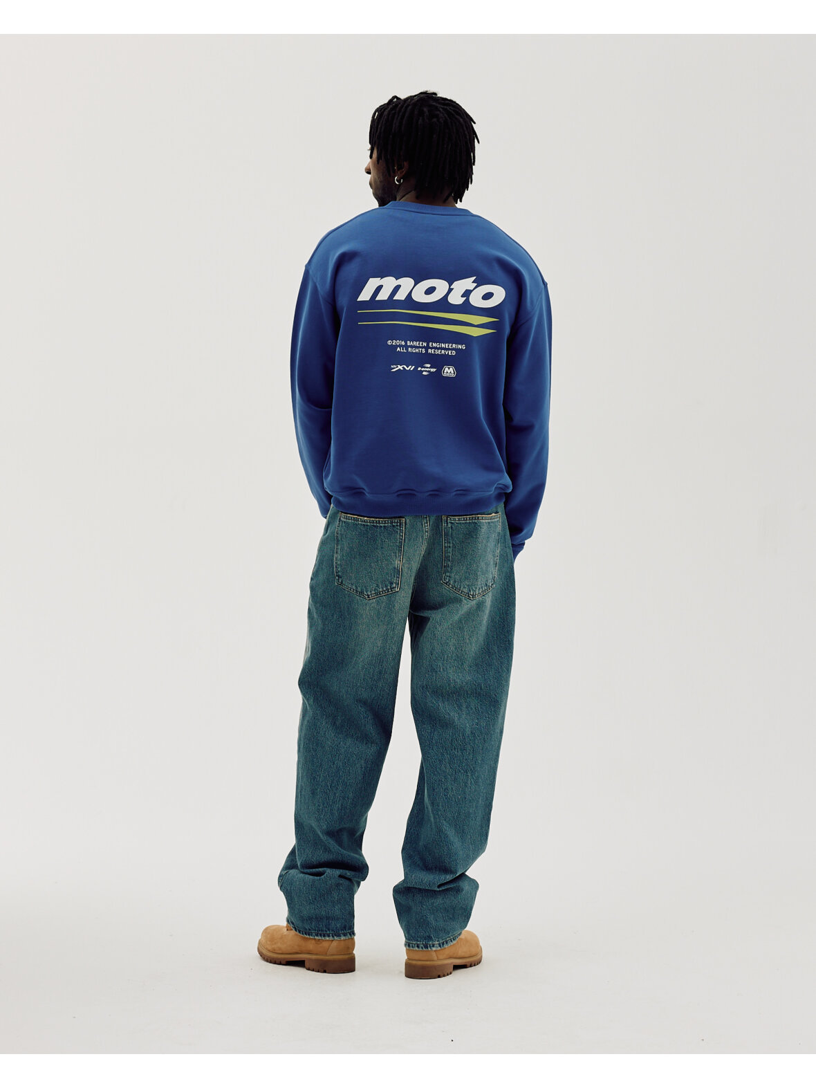 Her er beskrivelsen til den matchende crewneck i 'Cobalt Blue'. Jeg har fokuseret på at fremhæve det rene snit uden hætte, men med det samme rå "MOTO" udtryk.