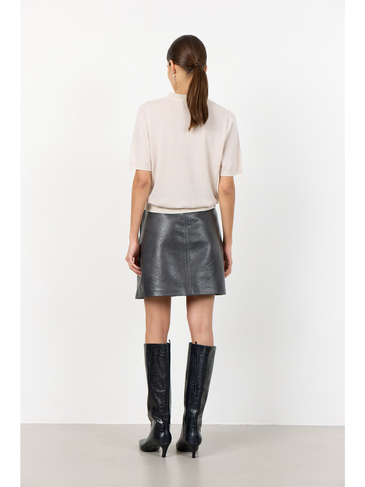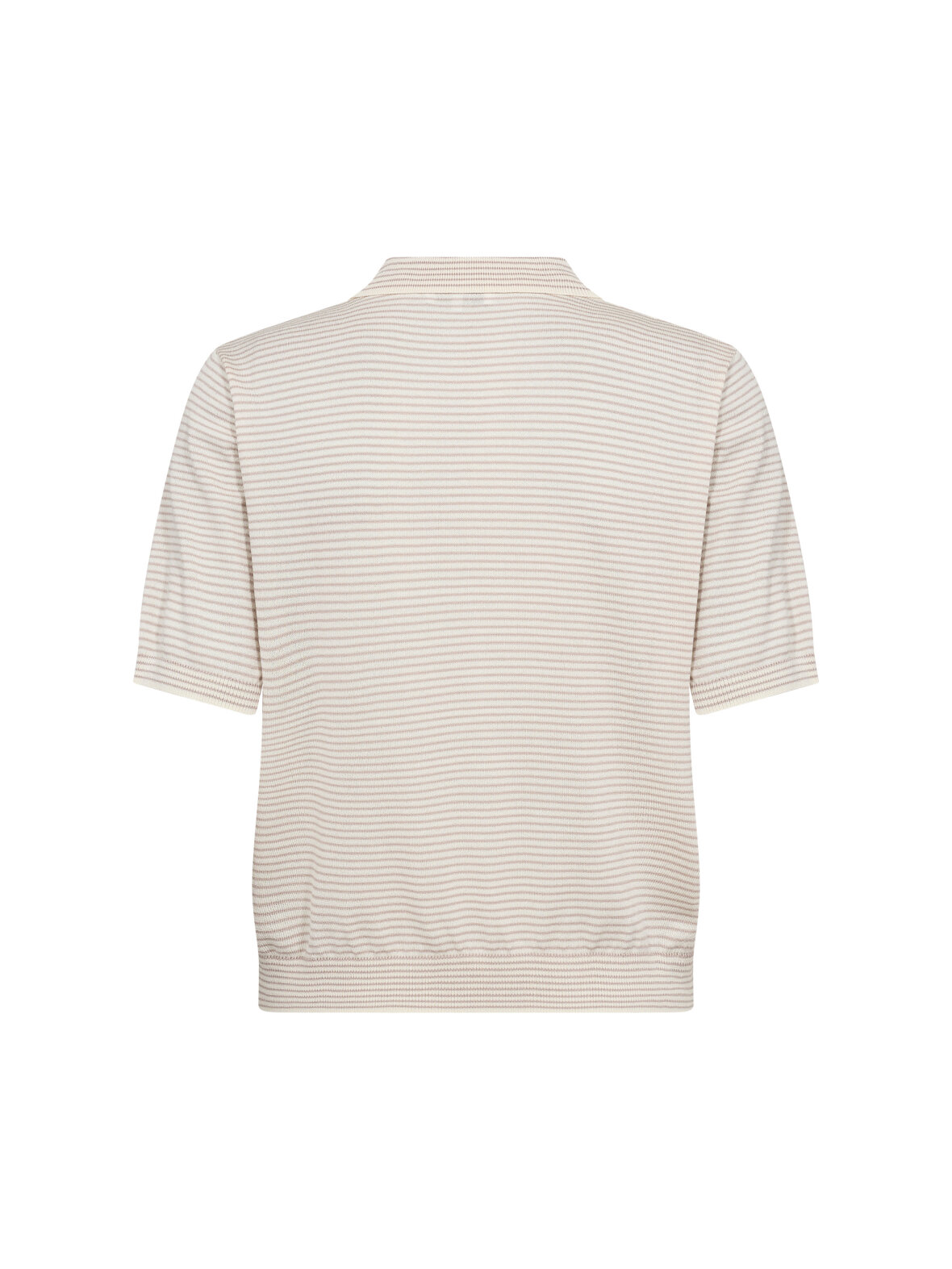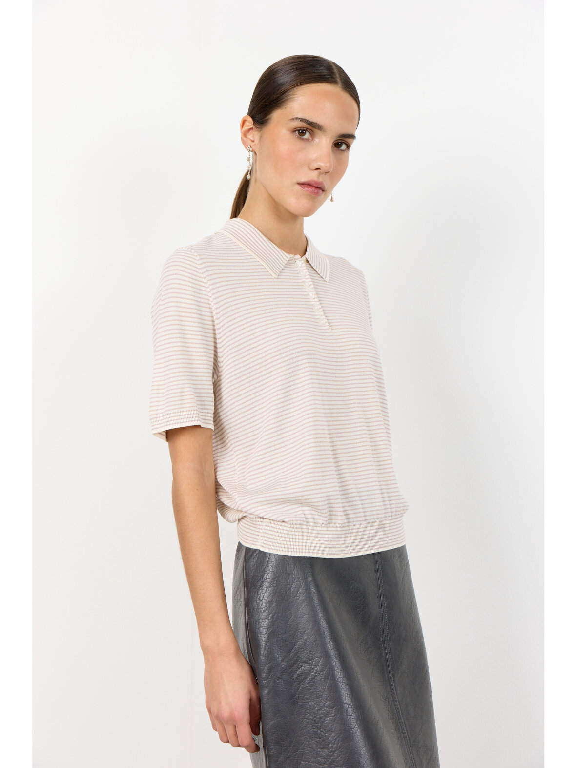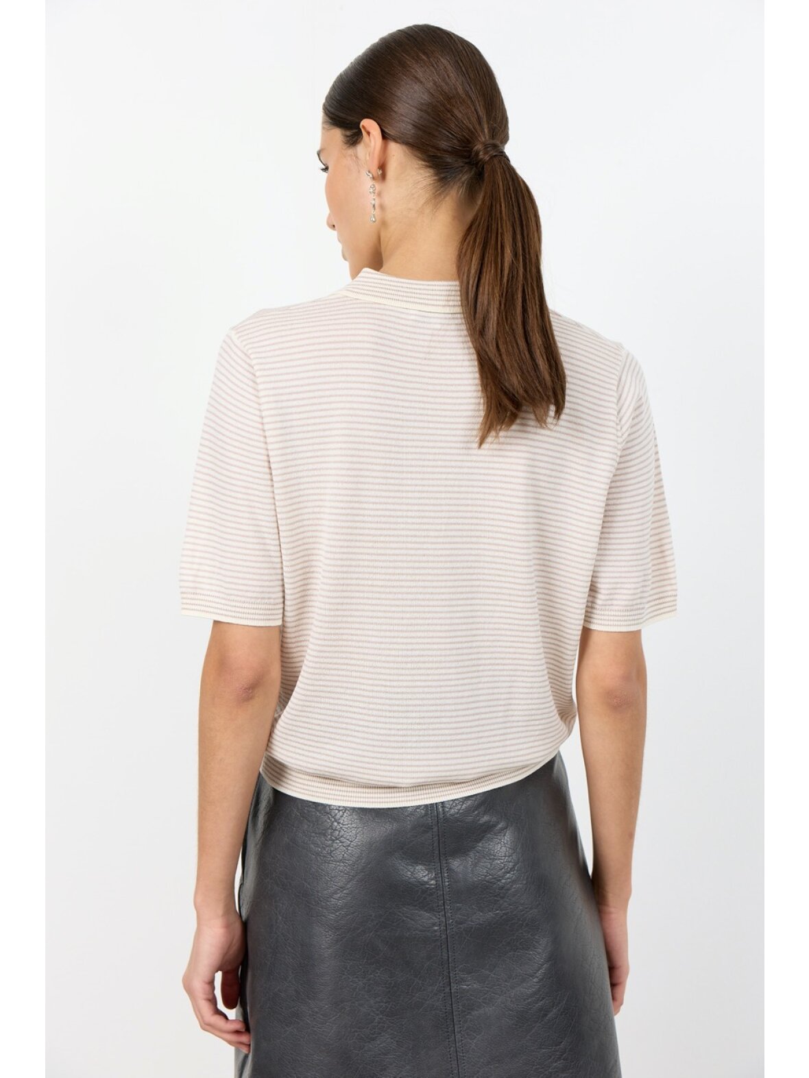 Klassisk elegance i en moderne fortolkning LR-POLENA 1 er den perfekte forening af en klassisk poloshirt og en feminin pullover. Denne stilfulde overdel fra Leveté Room udmærker sig ved sit diskrete stribede mønster, der giver associationer til det tidløse maritime look, mens den klassiske krave og knaplukningen foran tilfører et sofistikeret touch. Med sine korte ærmer er den et ideelt valg til forårets og sommerens garderobe, hvor man ønsker et let, men gennemført udtryk.